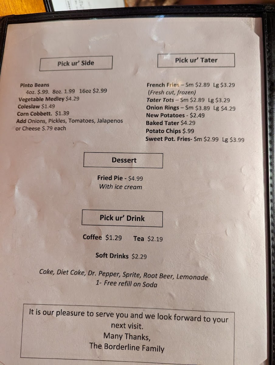 Welcome to Borderline Cafe, your next dining destination nestled in Powderly, Texas. The cafe boasts a mouthwatering menu that emphasizes hearty, homestyle meals perfect for any appetite. Choose from enticing options like the Hamburger Steak at just $1.00, or indulge in the succulent Ribeye for $22.99. The chicken fried steak, a favorite among patrons, is made to order, ensuring freshness and flavor in every bite.